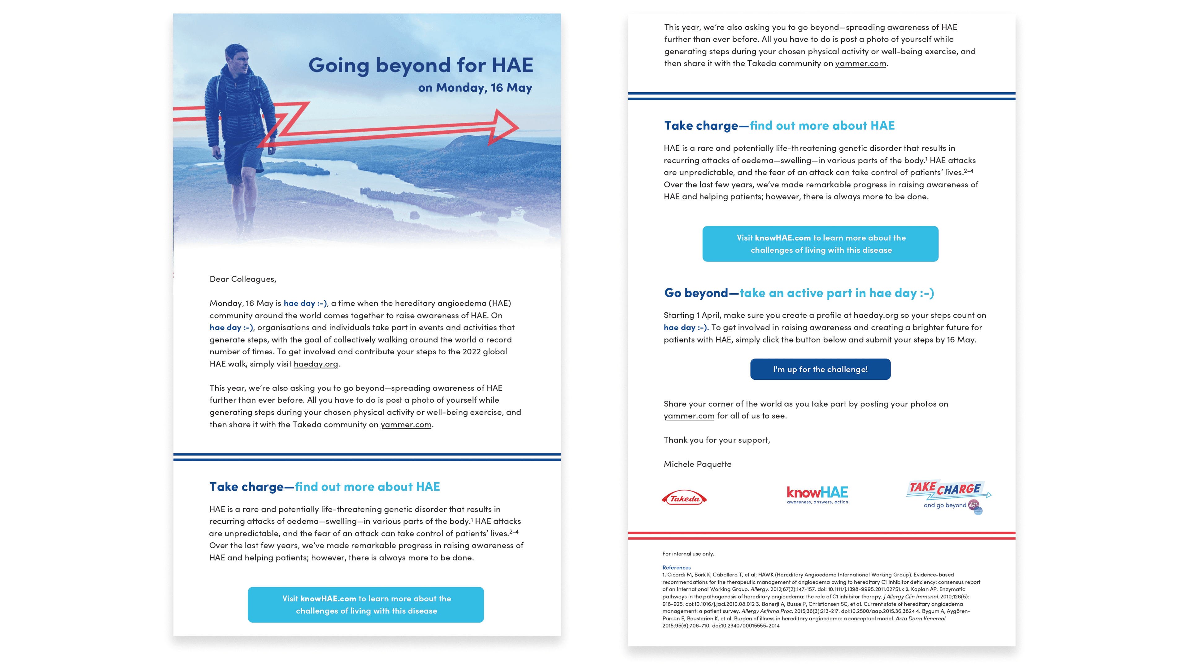 "Going Beyond for HAE" was a strategic internal campaign developed for Takeda to mobilise employees in support of HAE Day. The initiative focused on driving global participation in the HAE Walk, translating complex advocacy goals into a high-energy, actionable campaign that encouraged employees to register their physical activities as steps towards a collective global goal.