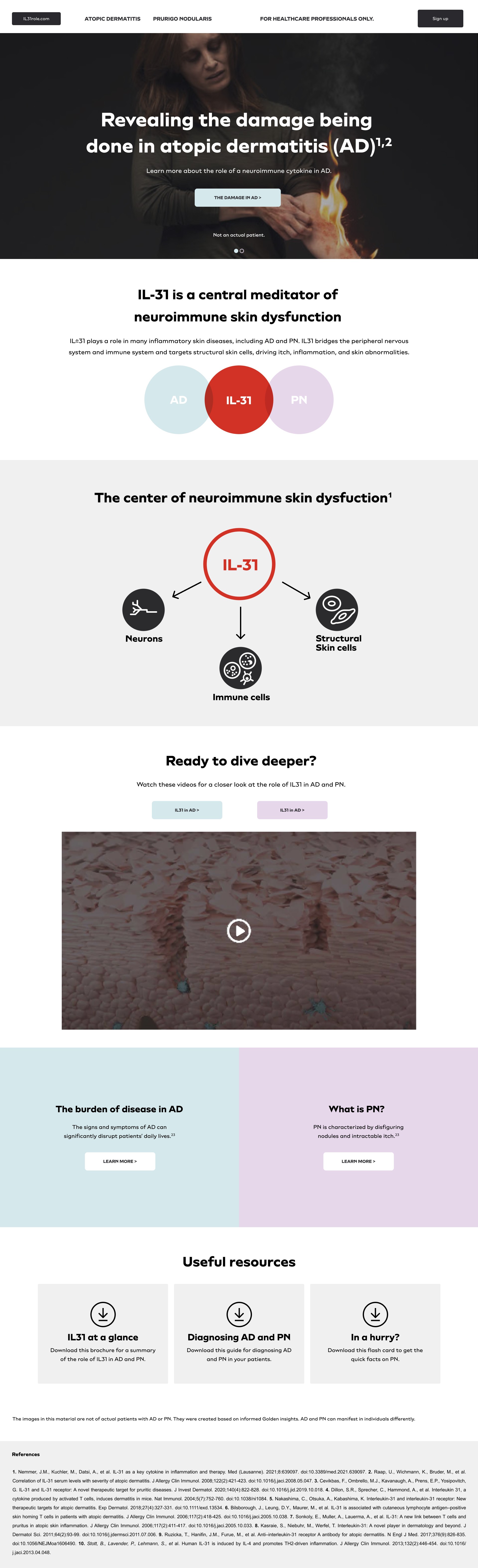 IL31ROLE is an educational microsite for healthcare professionals, exploring IL-31 role in neuroimmune skin conditions. It translates complex science into a clear, engaging, compliant, and visually intuitive digital experience.